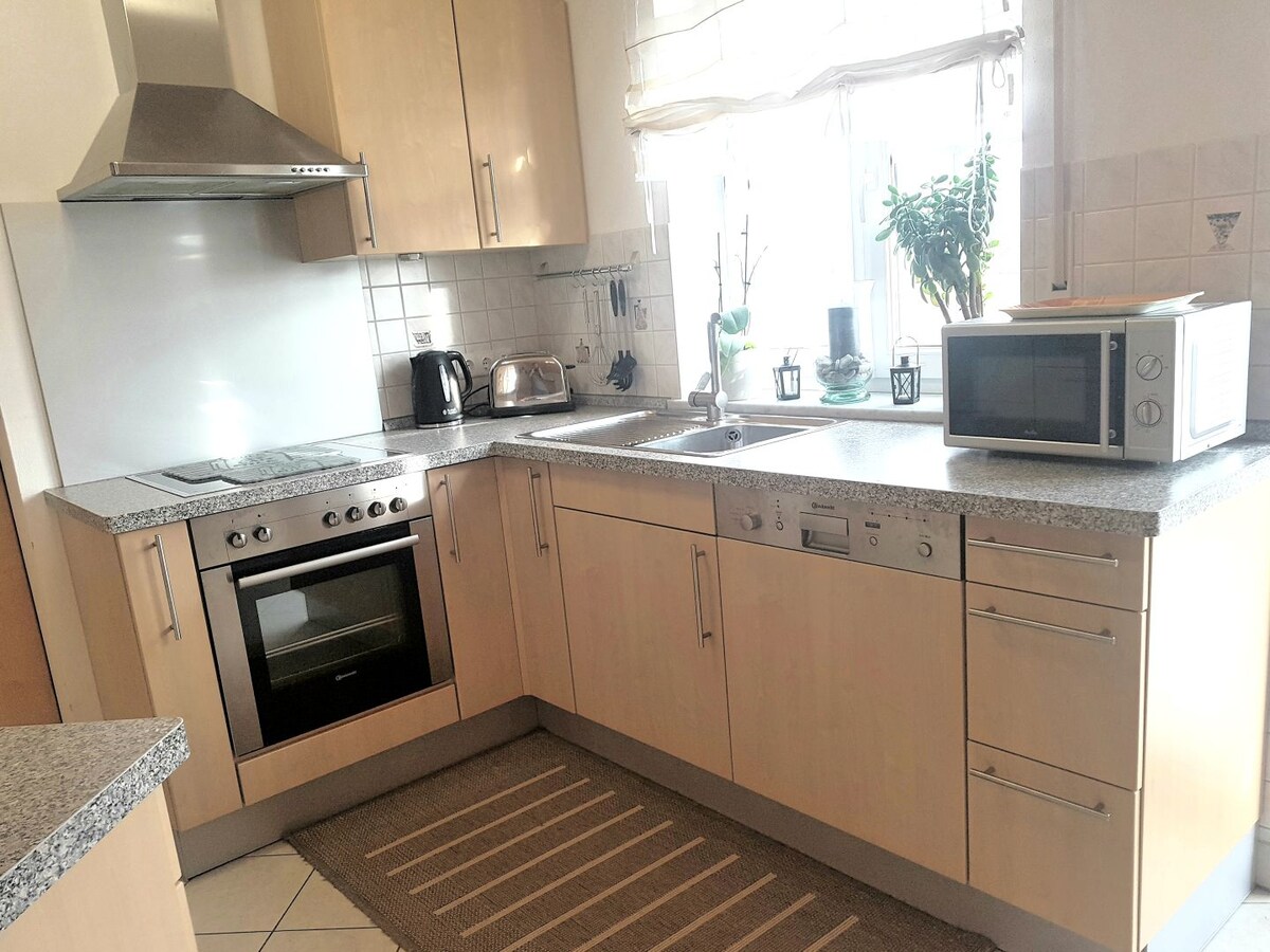Modernly furnished bright apartment with 2 bedrooms, sofa bed, living and dining room, fully equipped kitchen, bathroom with daylight, shower and washing machine, hallway with wardrobe. The apartment has a small terrace with chairs. The bedrooms are each furnished with a 120 x 200 cm bed, wardrobe and mirror, etc. A private parking space is also available at the courtyard. This is a basement apartment with daylight.