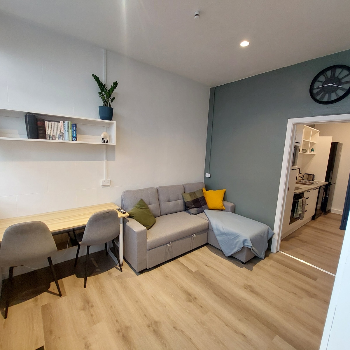 This inviting studio offers the perfect blend of comfort and convenience. Featuring elegant plantation shutters, central heating for cooler evenings, and a cozy queen-sized bed, it’s the ideal space to relax after a day of exploring Auckland. A dedicated workspace is also available, making it well-suited for both business and study stays.