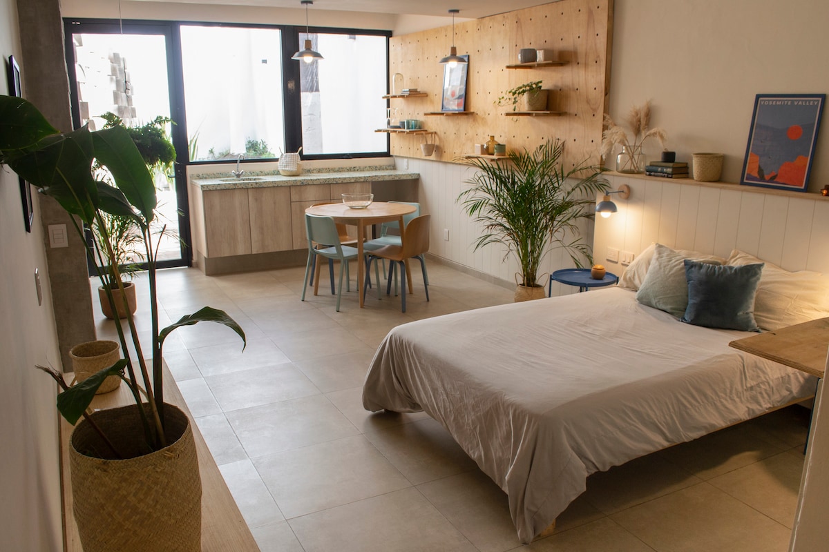 ✨ One block from Expo Guadalajara🏙️, this modern loft offers you style, comfort, and unbeatable location. It features fast WiFi, 75”screen, equipped kitchen, rooftop with breathtaking view, coworking and gym. Perfect for lounging, working or exploring the city. Located in Chapalita, top area full of bars, restaurants and shops. Up to 5 people can enjoy it to the fullest! 🌆🎉 (The fifth guest is subject to an extra charge per night, according to the listing rules).