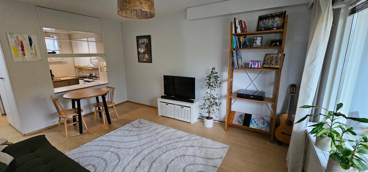 Take it easy at this unique getaway and enjoy your stay in this fairly new 34 m2 condo & studio (+13 m2 balcony). Calm neighborhood with excellent transportation connections makes accommodation comfortable and makes you feel like home. The bus stops are located right near near the apartment and the metro station is only a 5-minute walk away (450 meters from the apartment) which takes you to the city center within 12 minutes.