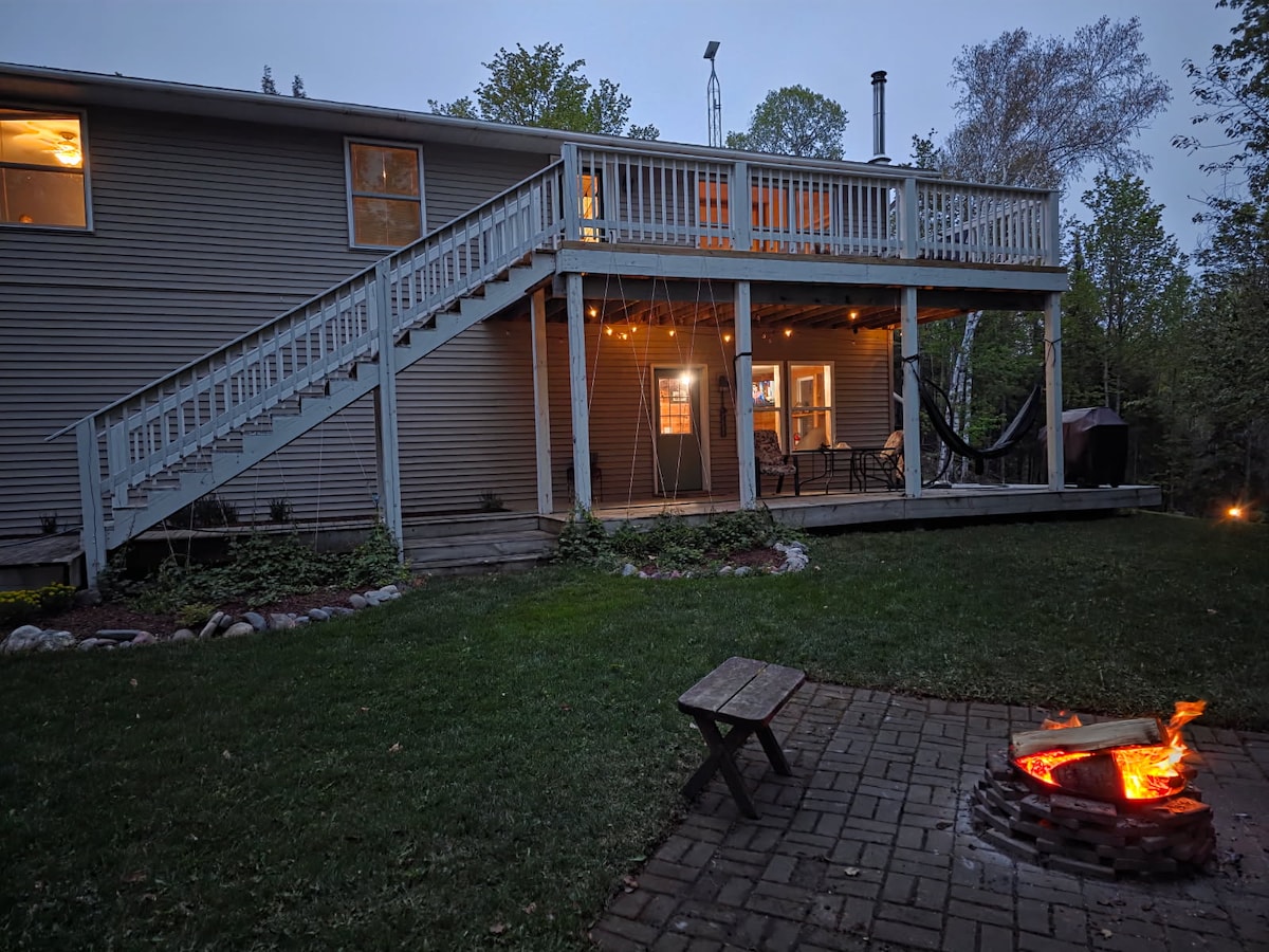 *low tox/fragrance free-Bring the whole family to Snowy Owl Lodge—Left Side! Sleeps 12 w/ 4 bedrooms, 2 lofts, 2 full, 2 queen, 2 twin beds, futon, & 2 full baths. Enjoy the hot tub, deck, grill, firepit, laundry & plenty of space to relax. Just steps from Ski Brule, 10 mins to town, on snowmobile trail & near 5 lakes including Blue-Ribbon trout streams. Perfect for all seasons—ski, snowboard, snow tube, snowmobile, fish, hike, hunt, bike, waterfalls, autumn colors, & more in the ❤️ of the U.P.