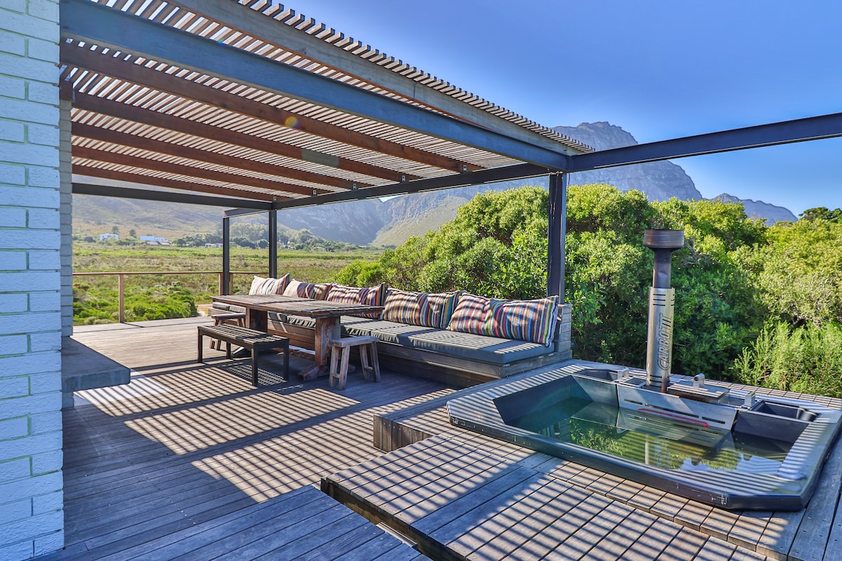 Floating in a 100% indigenous garden, this unique 4 bedroom beach house just 150m from the beach boasts fabulous sea and mountain views, and has featured in more than 15 magazines, incl. SA House & Leisure and UK Elle Decoration, and TV's Top Billing. It's the perfect spot from which to explore the Overberg. Take it easy at this unique and tranquil getaway and enjoy the wood fired hot tub for a romantic night or some fun with your friends and family.