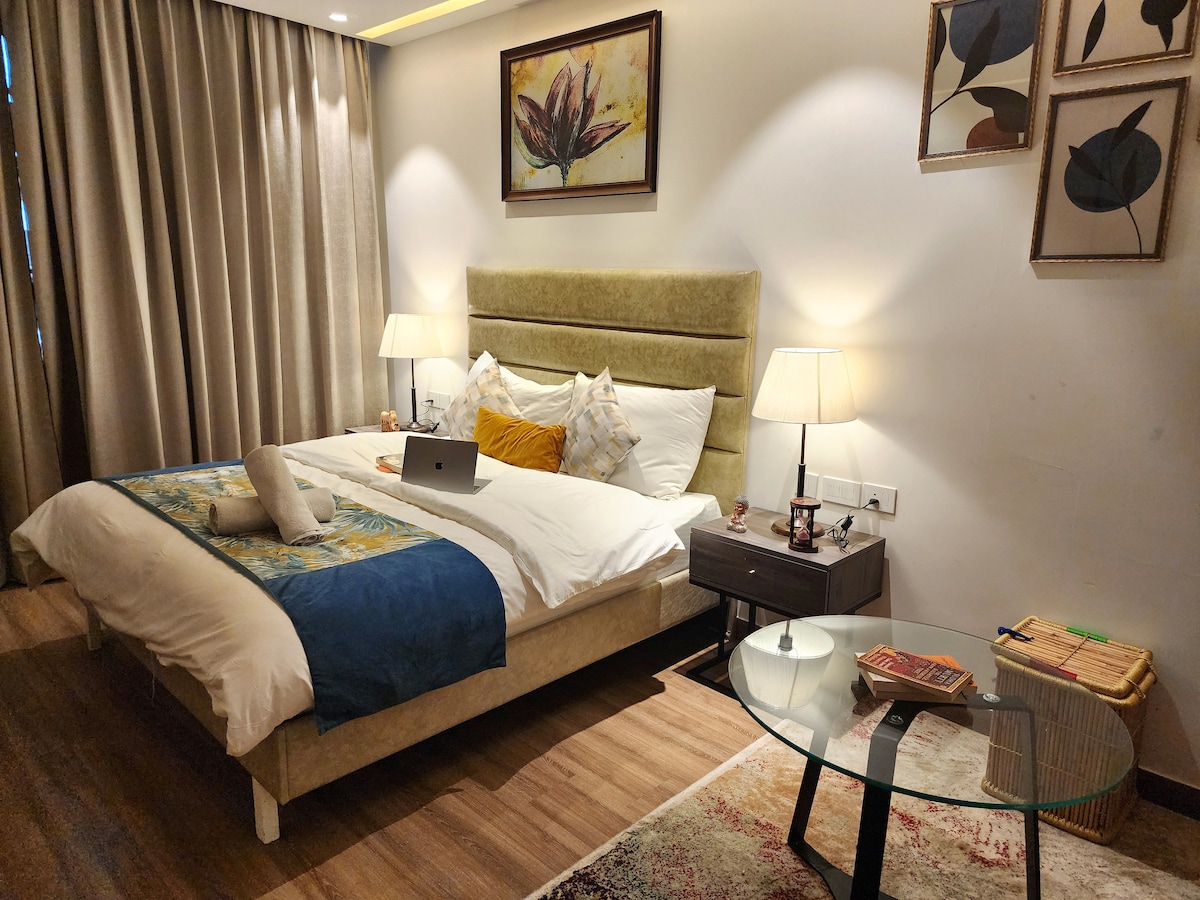 Welcome to Aureva in Gurgaon (10 mins from Golf Course Ext Road) where warm tones, and soft textures create a calming and elegant space. Thoughtfully designed for families, solo travelers, and couples who appreciate comfort with style. Indulge in nearby dining spots like Romeo Lane and Avatar. Enjoy the convenience of seamless connectivity via Sector 55-56 Gurgaon Rapid Metro and Huda City Centre metro