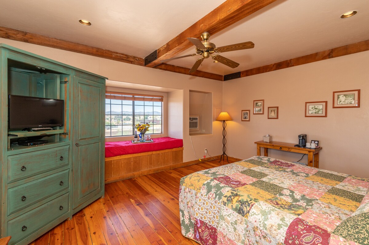 A tranquil, spacious, and beautiful Casita. Comfortable King bed with a gel memory foam mattress, additional pillows and blankets for your convenience, private bathroom, microwave, small fridge, toaster, coffee maker, and teas and coffee for a quick bite. Private entrance and a small patio with seating area, which leads to the staircase to the roof where you can enjoy the view during the day and the Milky Way at night. Large screen TV with Netflix and Hulu (bring your own passwords), and Wi-Fi.
