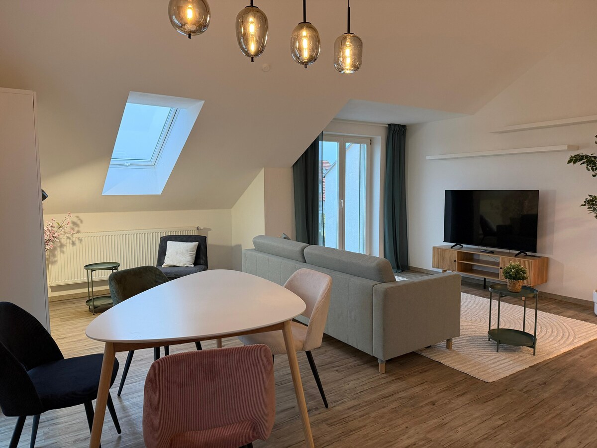 Welcome to HELLOFLATS and to this luxurious penthouse in the heart of Erding, which offers you everything you need for a great stay: → Erdings largest vacation apartment (also ideal for larger groups/families) → Super central, in the middle of the old town → Very close to the Therme Erding → Near MUC airport → Completely new and furnished to a high standard → 3 bedrooms with 4 comfortable box-spring double beds → Modern, spacious and fully equipped kitchen → Underground parking space