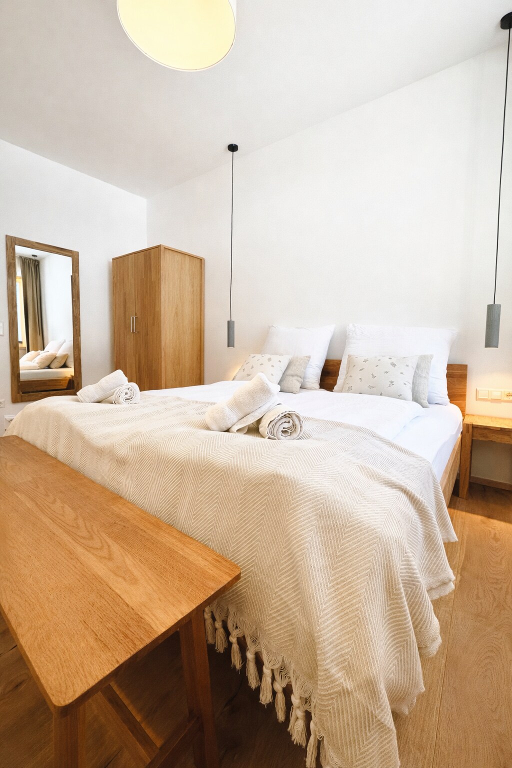 Completely newly renovated, 650-year-old old town apartment, only 5 minutes' walk to downtown in an absolutely quiet location in the beautiful Wehrgraben right next to the Steyr River. Special features are antique furniture, marble bathroom with underfloor heating, original wooden floorboards combined with the most modern amenities inconspicuously embedded in the charming ambience. Free use of TV, Wi-Fi, PlayStation. Due to the old building, it is pleasantly cool, even on hot summer days.