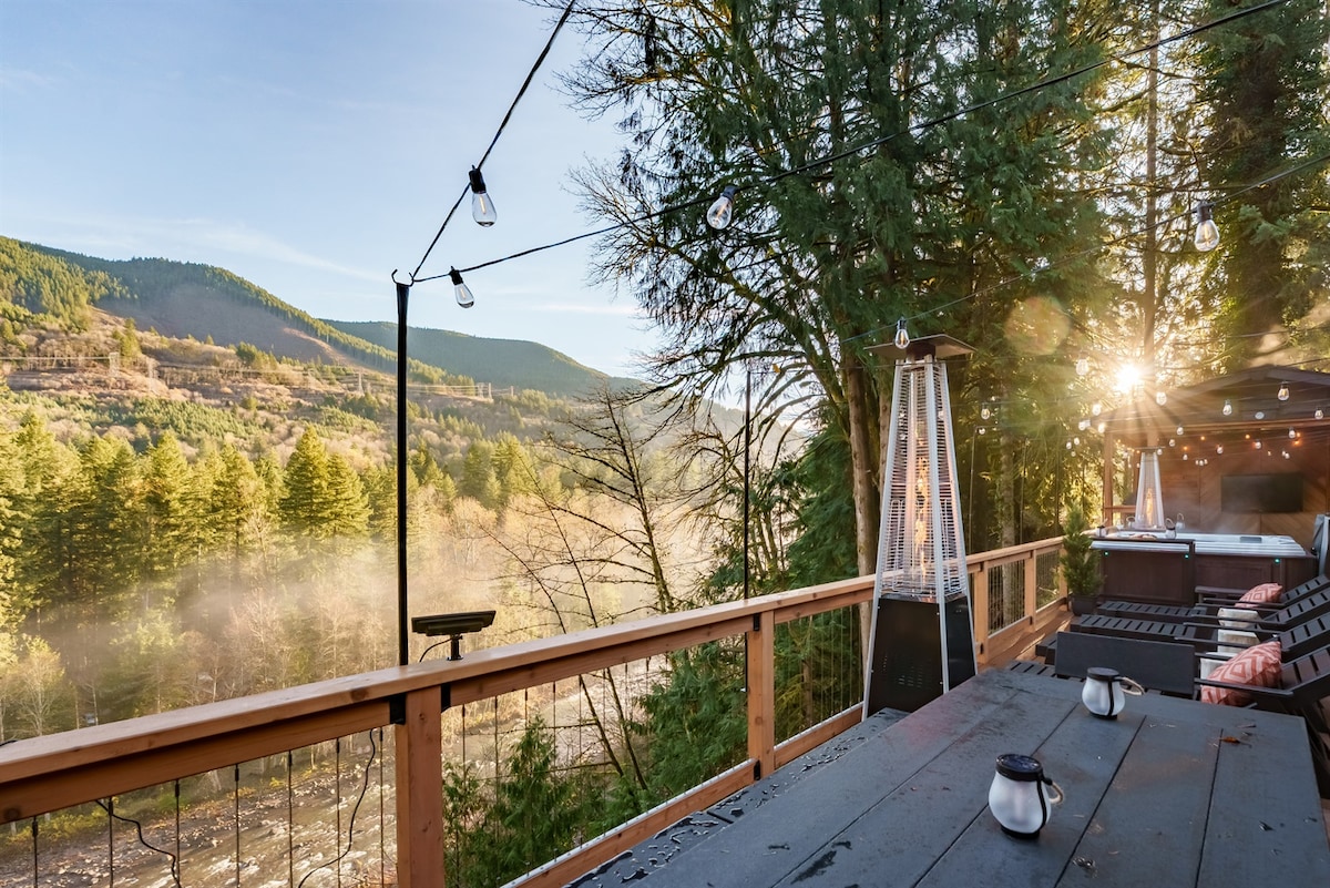 Surrounded by the massive evergreens of Mt. Hood National Forest, the newly renovated Hood Mountain Lodge is your basecamp for endless outdoor adventure or a peaceful enclave for a mountain get-away. Soak in the forest sounds on the expansive wrap-around deck. Cook a gourmet meal in the chef's kitchen. Or enjoy a glass of wine and soak in the hot tub or steam in the sauna. The choices are endless for outdoor adventure at your doorstep and indoor luxury after a fun-packed day.