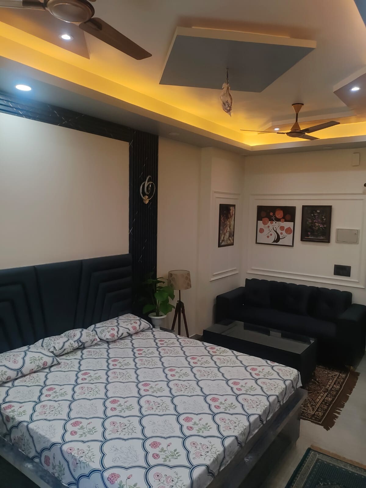 Welcome to this beautifully designed studio apartment located in the heart of Greater Noida West. Perfect for solo travelers, couples, or business guests, we offer comfortable stay with all modern amenities. What You’ll Love: Spacious, well-lit room with a luxurious queen-sized bed. Elegant ceiling design with ambient lighting and stylish fans. Smart TV with entertainment setup and cozy seating. Air-conditioned comfort. (but no hot water) Private balcony. Refrigerator. Clean, modern bathroom.