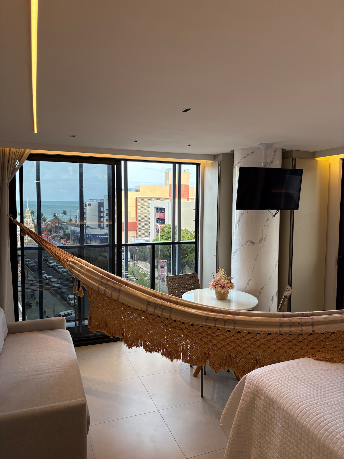 Relaxe neste lugar único e tranquilo! Loft novo, recém mobiliado, em frente ao mar do Bessa, perfeito para famílias pequenas (até 4 pessoas) ou para viajantes individuais. Está dividido da seguinte maneira: suíte de casal com cama queen com smart TV e estação de trabalho, cozinha completa com principais utensílios, sala-de-estar que possui um sofá-cama tamanho cama de casal, smart TV e uma varanda frente mar deliciosa com uma belíssima vista do primeiro amanhecer das Américas.
