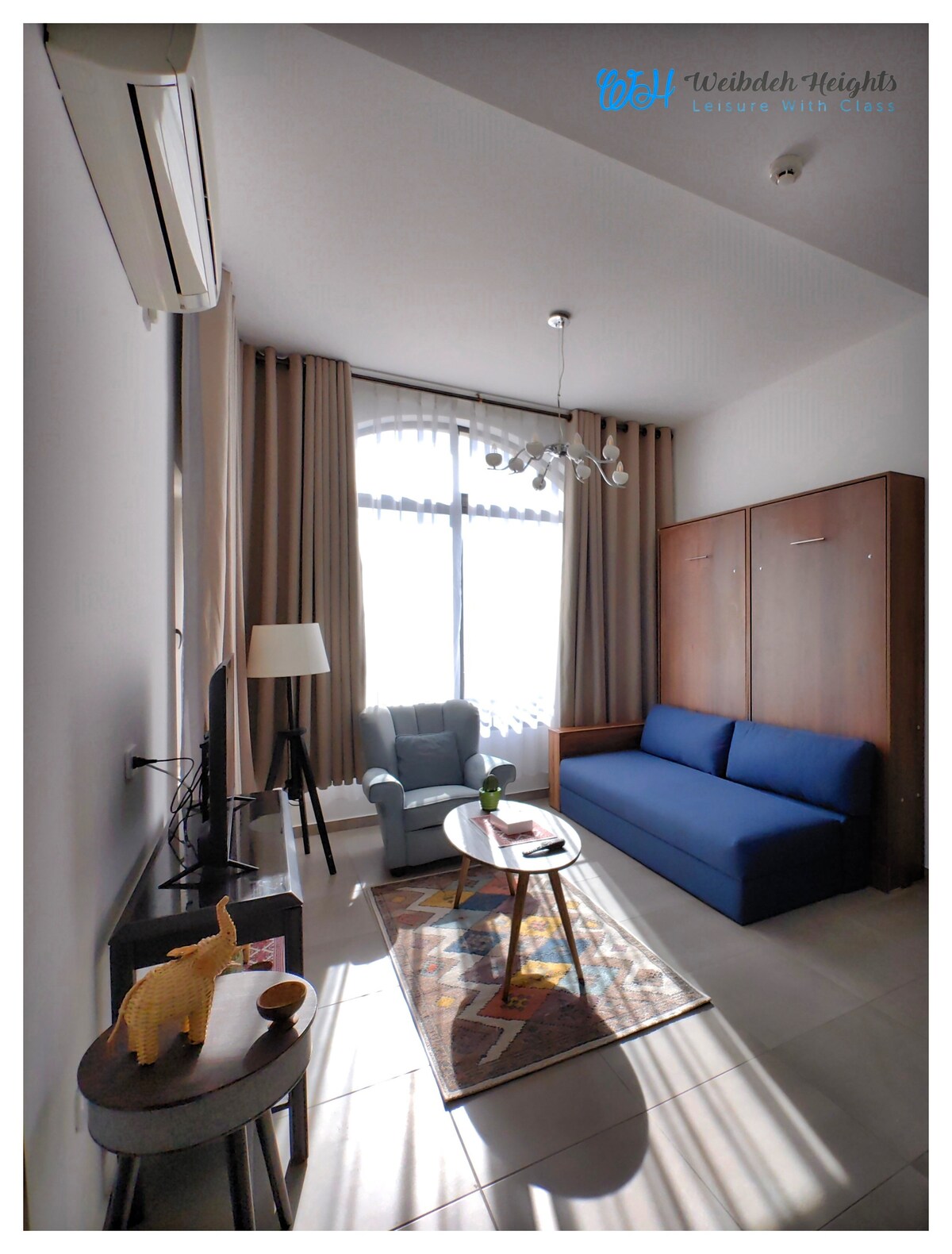 Located under open skies in a prime location in Amman, this one-bedroom rooftop retreat boasts a serene mountain panorama. A cozy spot, featuring a comfortable sofa-bed, blending seamlessly with a well-equipped kitchen. The tranquil ambiance makes it an idyllic haven, inviting moments of calm and relaxation amidst breathtaking views. Enjoy the convenience of nearby markets, dry cleaners, just a few minutes away for the Business Park and City Mall.