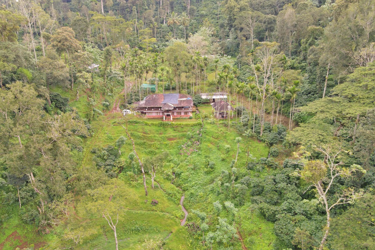 A peaceful 3-bedroom bungalow tucked away in the heart of our lush coffee plantation in Coorg—perfect for a group of friends or a large family looking to relax, reconnect & recharge. 15 mins from town, the bungalow offers complete seclusion amidst nature. 2 bedrooms are air-conditioned. The only sounds you'll hear are the rustling leaves & chirping birds (15 varieties). Look forward to hosting you w/ home cooked food & privacy.