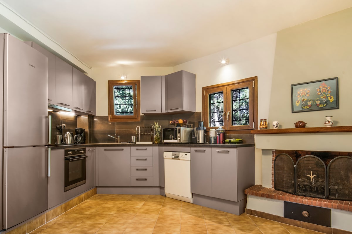 Dainty little house surrounded by old pine trees, shy owls and adorable squirrels in Professors Settlement-Vourvourou. For those who don’t know the area, this is your chance to explore it-local style! Downhill to the closest beach, 2min by car or 10min walk. Uphill on the way up (15 min walking unless you are super fit) through secret paths for the more adventurous. Restaurants, supermarkets, windsurfing, 5min by car or 22min walking. We answer all your questions and help in any way possible!