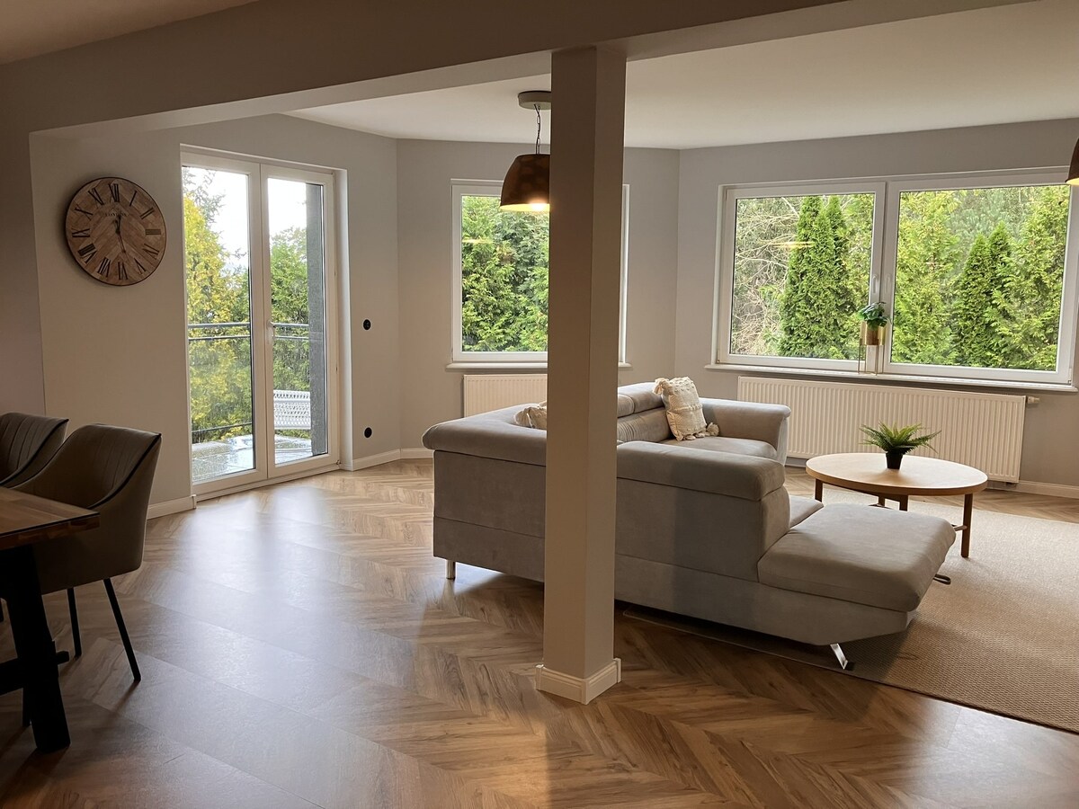 Relax and unwind in this serene, stylish space. Welcome to a modern , comfortable, year-round house in Kashubia(60 km from the Tri-City). We offer you spacious, fully equipped interiors- Ground floor with dining area and fully equipped kitchen, living room with large folding corner, fireplace , TV50" ,toilet. A floor with three spacious bedrooms and a bathroom . The house has a large terrace with a hot ball, barbecue, fire pit and recreation area in the garden.
