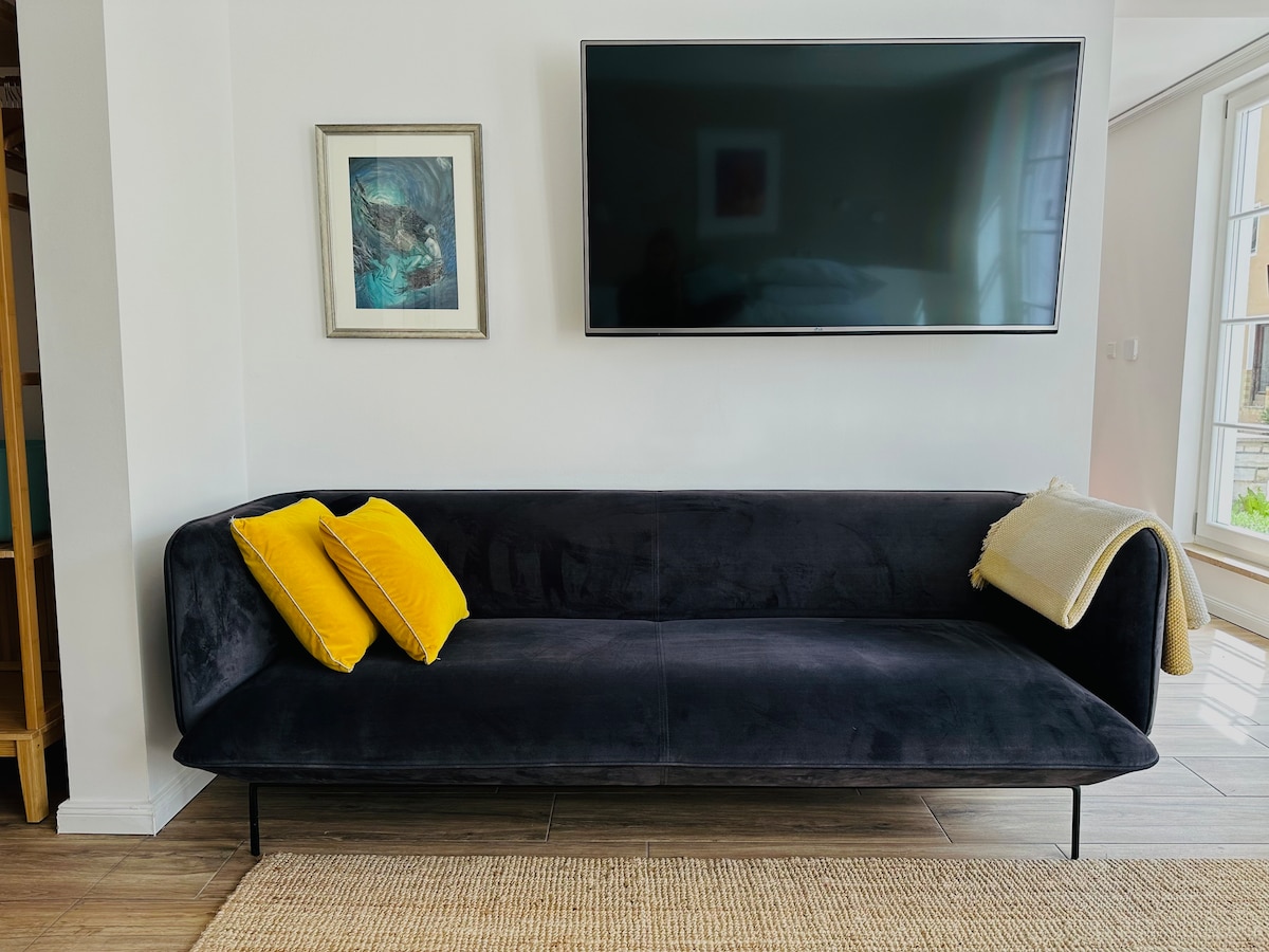 The apartment is in the newly renovated attic of a listed large house in 2023/24 (after a major fire in 2022 in the house, everything was completely renovated). It is well equipped, cozy and offers plenty of space for families with children. Wi-Fi, TV and a play corner are included. There is also a fully equipped kitchen and a bathroom with shower and toilet. Dogs can be brought along. There are two cats in the house: Mimi and Sally.