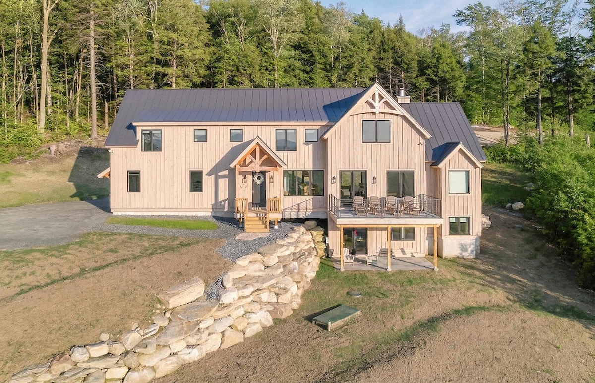 This bright, well-designed Scandinavian-style chalet is the perfect cozy retreat. Nestled in the woods on a plot of 20+ acres, it offers scenic views and a private hiking trail leading to beautiful vistas, transforming into a winter wonderland for skiing adventures, a summer paradise for outdoor relaxation, and a vibrant canvas for leaf peeping during Vermont's stunning fall foliage season. Goodland wood burning hot tub is available 365 days a year.