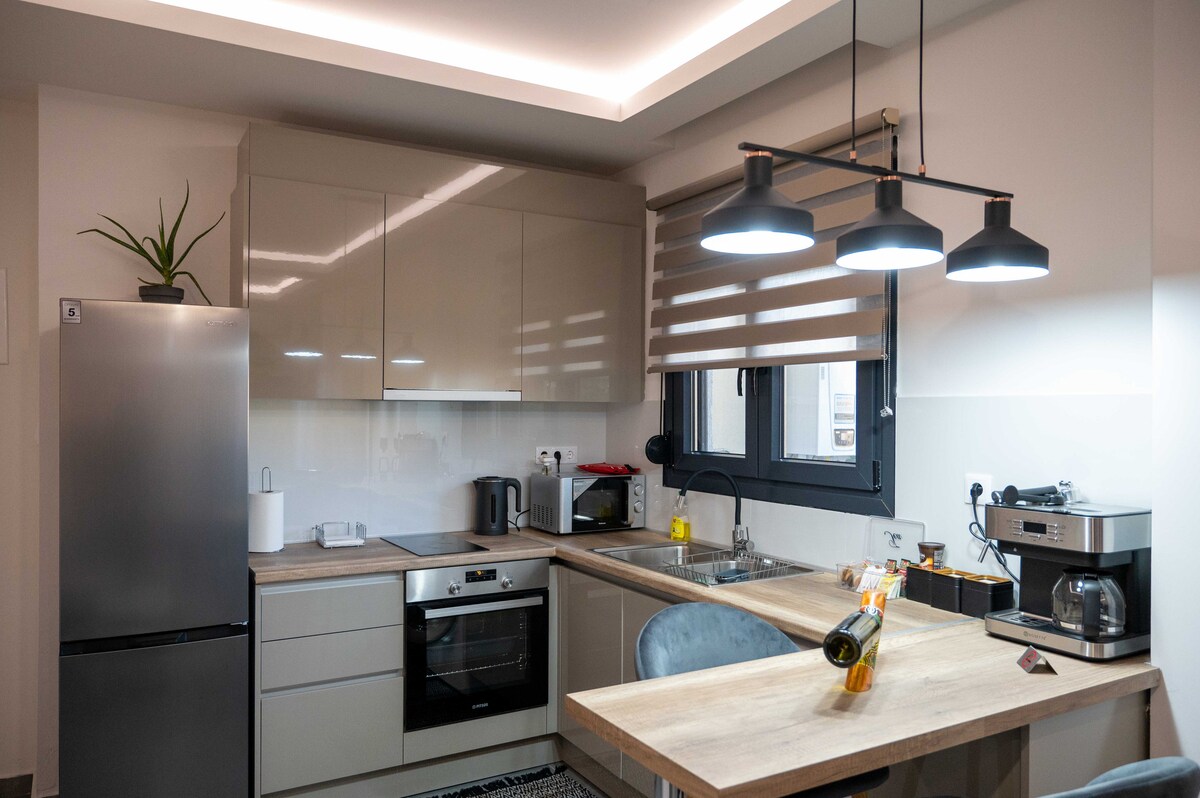 A beautiful, spacy, light rooftop apartment with views of the sea and mountain. 3 minutes from a blue star beach and a 5 star hotel. It has descent furniture, tableware, fast WIFI, TV channels from all over the world, HIFI system, air-conditioning, gas heathing, private parking, three balconies, elevator, intercom and a big walk-in closet. Close to Gerovassiliou (wine house), airport (15min), boat to the city centre in summer (45min). For a small fee we can pick you up from the airport.
