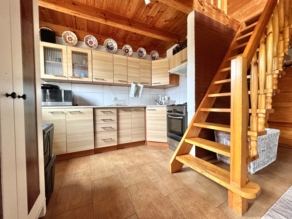 It is the perfect place for those looking to escape the city noise. Perfect for a weekend getaway or a longer stay with the family. Close to the beach on Lake Rydwan The cottage is a year-round house with hot/cold air conditioning; with a large terrace The kitchen is fully equipped with induction cooktop, dishwasher, oven and fridge. The cottage is located in the countryside, and has beautiful views of the fields and forests. A 20-minute walk is a store.