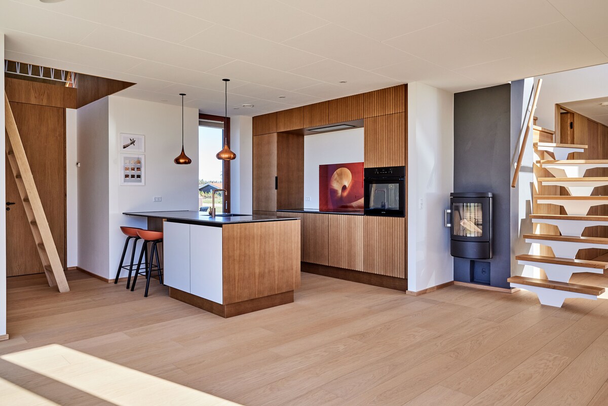The Hayloft is the ideal retreat for two people. The gable is completely glazed and offers a magnificent view of the private lake and the national park behind it. In the middle of the room is the "Magic Box." It houses the kitchen, a dining area and the dressing room. At the top of the box is the gallery bed, which has a view far into the national park through the glass parapet. In the garden there is a deck and a work studio. 200 m to the sea.