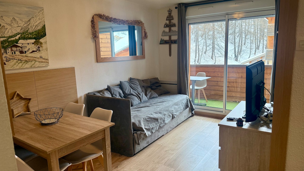 Appartement F2 34m2 au pied des pistes et des sentiers de randonnées, pour 6 personnes max. Situé quartier la Sestrière, vous bénéficiez d'une vue sur les montagnes et d'une belle exposition. Au pied des pistes, proche des loueurs, de la luge d'été et des commerces. En hiver, une navette gratuite s'arrête au pied de la résidence. Appartement tout confort, vous bénéficierez d'un accès à la piscine chauffée, sauna, hammam ouverts durant les saisons d’hiver et d’été. Casier à ski. Terrasse.