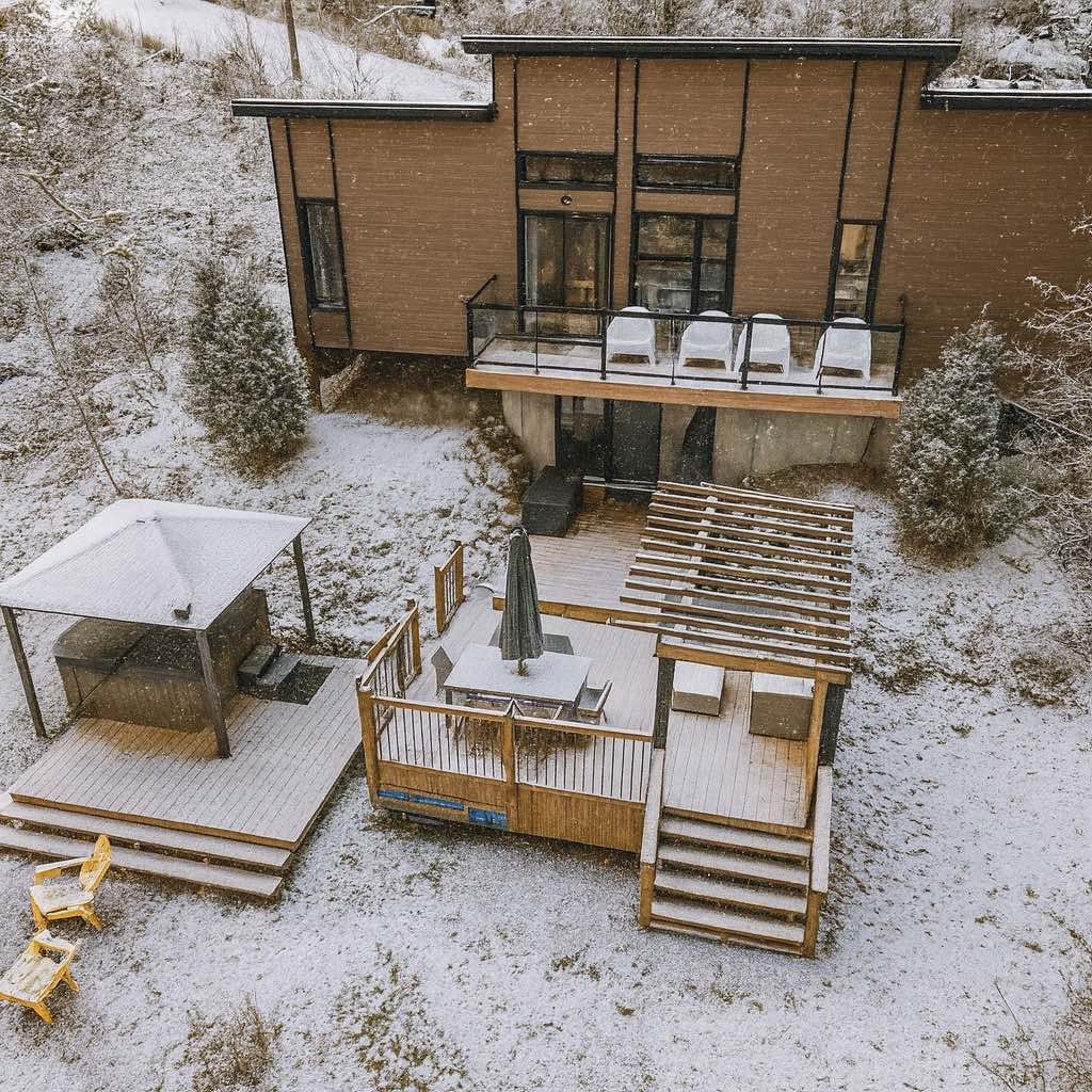 Our Nordic forest chalet is perfect for spending quality time as a couple (or with a kid), or for a work-retreat (with high-speed WiFi). The wooden interior is warm and cozy. The full-height windows offer stunning views over a forested valley. The open-concept kitchen and living room keep you in the conversation while cooking. If you prefer to cook outside, there is a fire pit with a grill and outdoor dining table. Only 70-min drive from Montreal. The lake is a 25-min walk if you park nearby.