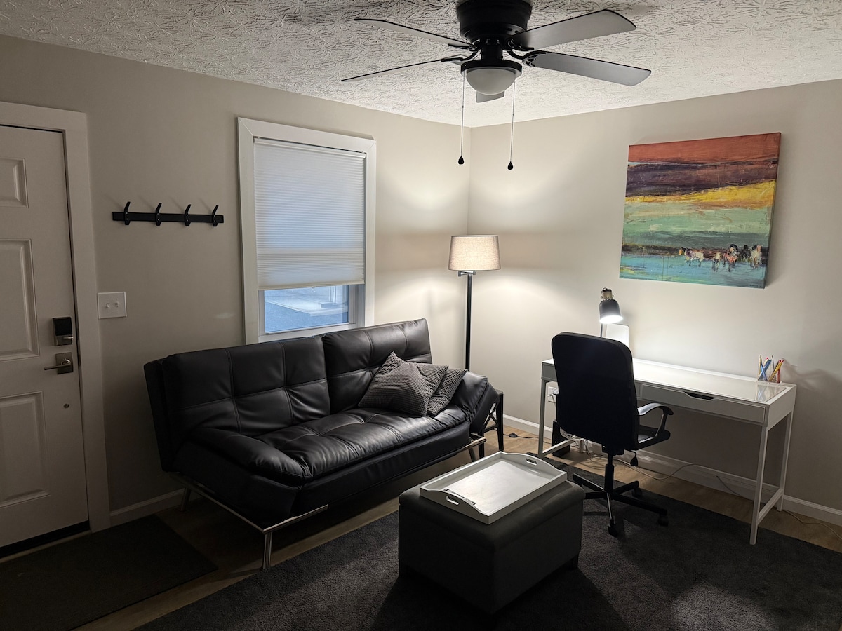 Studio located on private wooded 20 acres with 800 sq foot of space, crafted with reclaimed materials wood and metal. Large deck overlooking 7-acre lake with burn pit. Private entrance with electric fireplace, television, music, Queen size bed, sofa, bar with stools, refrigerator, 2 burners cook surface, microwave, Keurig, toaster, dishes and cookware. Private bath with compost toilet, shower and sink. Access to paddle boat with life jackets available. Fishing rods if you want to try it!