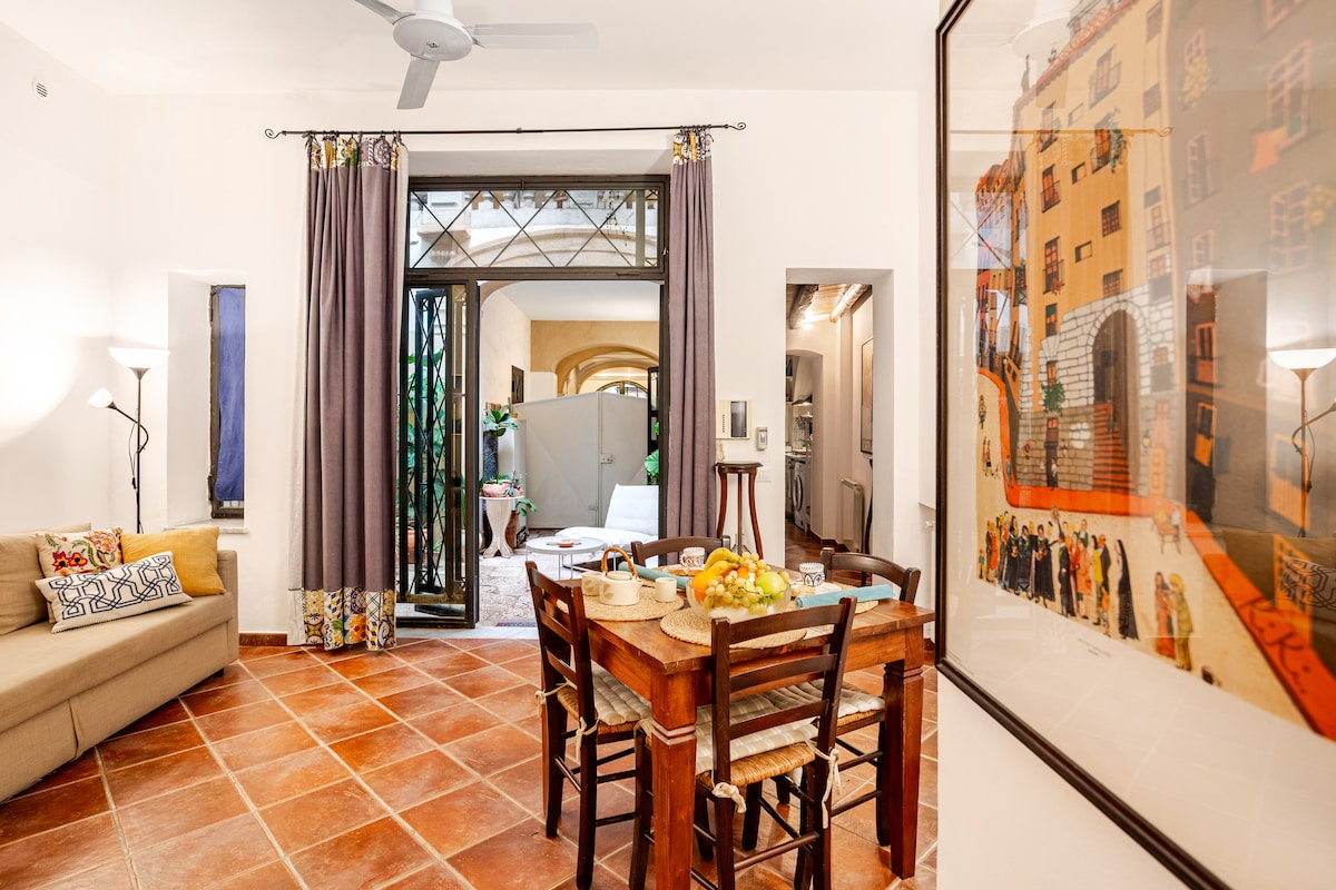 Cortile Galletti is a spacious and charming flat with its own exclusive, original courtyard. The apartment is located on the ground floor of the newly renovated Palazzo Galletti, an old nobiliary residence. Stay in the pulsating heart of the Sicilian capital at walking distance from all main attractions. The flat is 2-minute walk from the train station, two blocks away from Piazza Magione, and a short walk to the beautiful and picturesque markets of Palermo: Ballarò, Capo, and Vucciria.