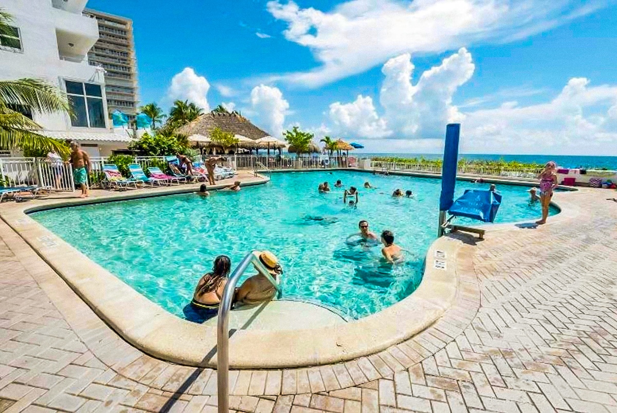 Ocean / Beach side views from master bed & indoor balcony! Beach is on premises - Free beach access- No resort fee! Fully Renovated NOTE: WE HAVE 3 UNITS-INQUIRE IF Booked . Sleeps 9-Large cozy 2 bedroom condo -Large pool. Located on premises :Spa-Coffee bar-Yoga-Tiki Bar-Sports bar-Happy Hour-D.J -Jet ski rentals ( next door ) & more..Outdoor Dining on the beach- indoor restaurant with entertainment Free shuttles to local restaurants! 2 blocks from Dunkin-Liquor-Publix -pizza-& more