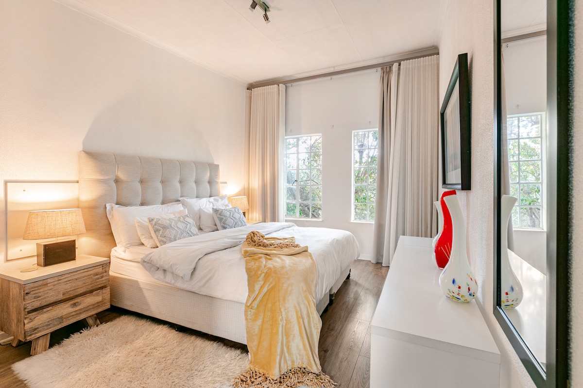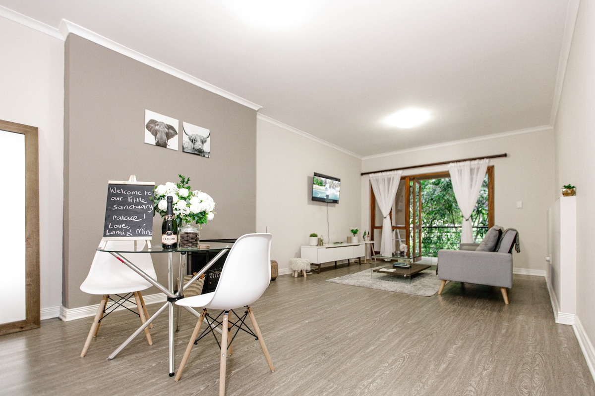 A charming, solar powered, trendy garden cottage in a central, leafy, Joburg suburb. One bedroom with a queen size extra length bed, kitchenette, bathroom with toilet and shower, lounge with a smart TV, dining room, study area and uncapped WiFi. Our upmarket, spacious, secure, bright and beautifully furnished garden cottage in the upmarket area of Houghton (1 km to Rosebank) has the feel of being on a farm yet central to everything.