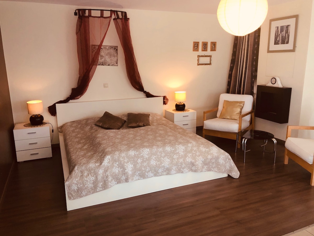 You will stay in a spacious room with a wonderful view of the rolling hills of ErezĂŠe. The room has a double bed (160x200cm), shower with sink, a separate toilet, a small kitchen with stove, oven, fridge, microwave, Senseo machine, kettle, toaster, ... All the comfort to enjoy breakfast in the morning! Bed linen, 2 small bath towels, and cleaning included