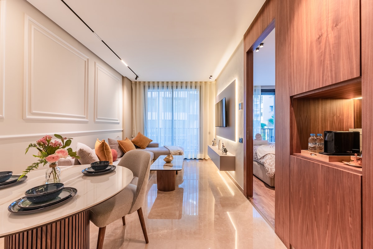 Bienvenue chez H Suites Casablanca, cet appartement de 50m² a été pensé et aménagé en suite privée, offrant un écrin élégant au cœur de la ville. Cette suite offre une chambre avec grand lit 160*200, un salon raffiné avec salle à manger, une cuisine équipée et une salle de bain moderne avec douche italienne et nécessaire de toilette. Accès autonome, wifi, climatisation. Idéalement située, à proximité du Bd Ghandi, commerces et restaurants, station Tramway à 150m, à 10 min de Casa Finance City.