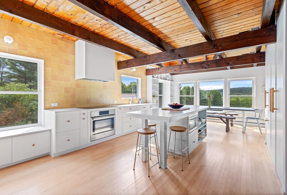 Woodward Haus is a stylish MCM retreat with wood, glass, & stone design. Perfect for remote work, a romantic weekend, a multifamily gathering, a girls' weekend, or retreat. MRV offers all season fun: farmer's market, swimholes, farms, hiking, road & mtn bike, golf, climbing, tubes on the river and lake, can't be beat. The house is nestled in the woods w/ beautiful views mountains. The area's food & breweries, including Lawsons are phenomenal. 1 min to MRG & 14 min to Sugarbush. Exp Wifi