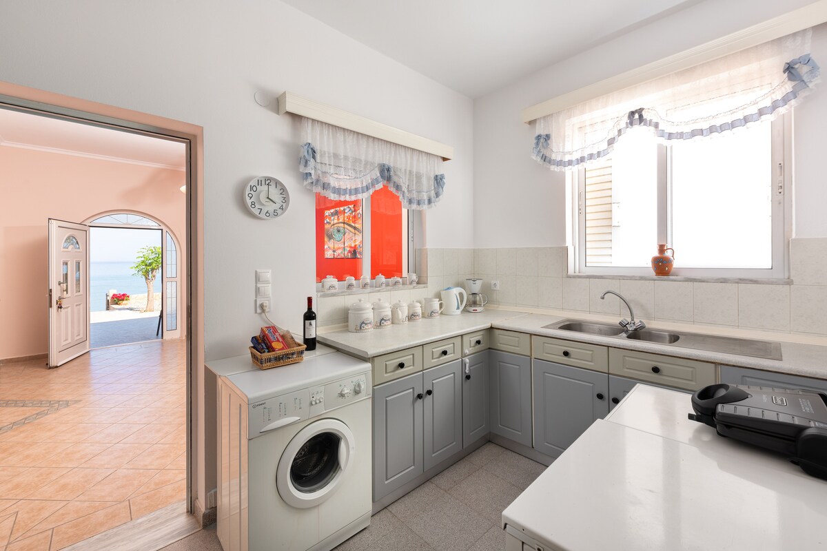 Magnificent view with a large courtyard in front of the house, the sea is about 5 meters away. The indoor space is 90 sq.m and the local area is quiet. The ground floor of the house includes a kitchen , a bathroom and a living room with a sofa-bed . The first floor has a large bedroom with a large bed for two people and a second bedroom with two single beds. Also there is a small restroom.