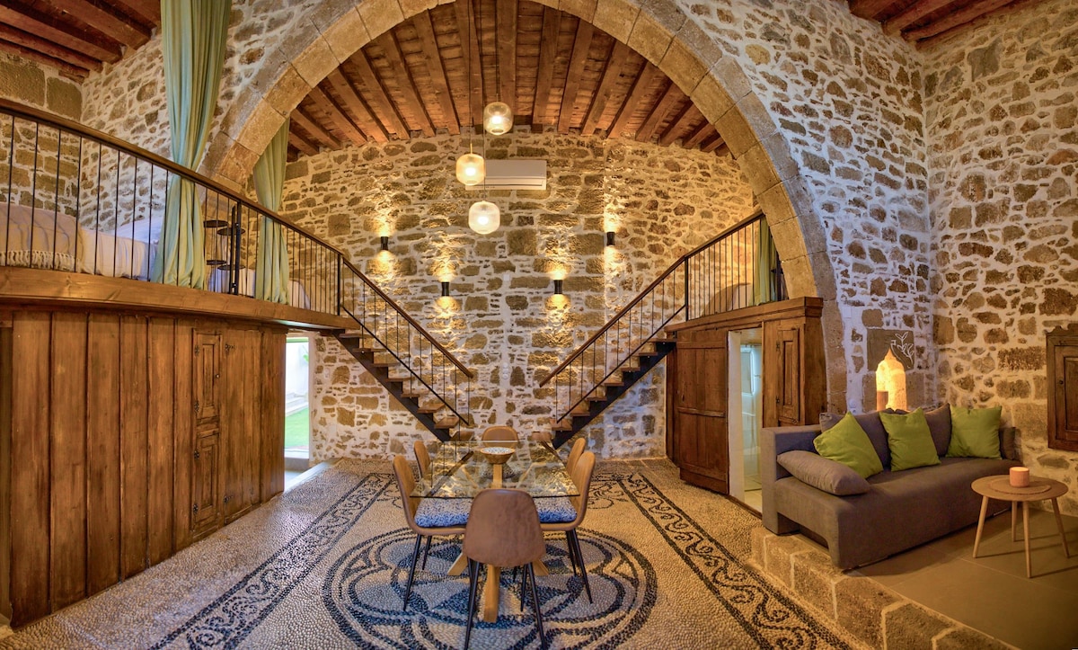 "Introducing "Mareò” Traditional Retreat"! This charming house, nestled beneath Archangelos Castle in Rhodes, offers a rustic yet elegant experience. With its stone walls, exposed beams, and tiled floors, it exudes timeless charm. The well-equipped kitchen and farmhouse-style dining area are perfect for meals. Upstairs, comfortable bedrooms await, along with luxurious bathrooms. Step outside to the courtyard, where you'll find the outdoor jacuzzi with a stunning view.