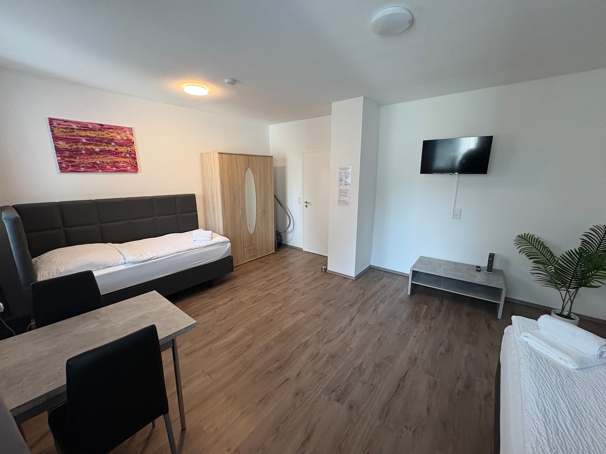Welcome to CASE Apartments Marl: Stylish studios in industrial chic, centrally located near the pedestrian zone and yet quiet - with their own kitchen, smart TV, fast WiFi and free parking directly at the building. Barrier-free access on the ground floor. A modern laundry room with washing machines, dryers and irons is available to all guests. Supermarkets and restaurants are within walking distance - ideal for business and long stays! The Marl Chemical Park is only a few minutes away by car.