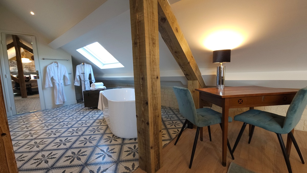 Bed and breakfast: double bed, TV, Wi-Fi, shower and toilet. Dining area equipped with a microwave. Breakfast provided. In a 300 m² Champagne house (where we live) with swimming pool and outdoor hot tub heated from May to September. A free gym. A private spa/sauna/ hammam wellness area with a participation of €10 per person for 1 hour. Massage by reservation. Bikes, a barbecue available. Three other rooms available for rent