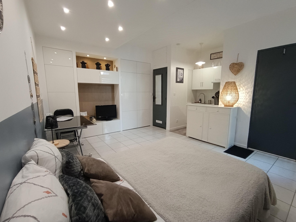 On the 7th and top floor, a secure residence, with a terrace, an elevator and a designated private parking space. At your disposal, 24 m2. At the foot of the MOULARES tram stop, it is located in the Rives du Lez district, close to all amenities (shops, restaurants). Ideal for your comfort, equipped kitchen (microwave, stovetop, coffee machine, kettle, toaster), in addition, a sofa bed with a 140/190 mattress. *Linens and towels - provided*