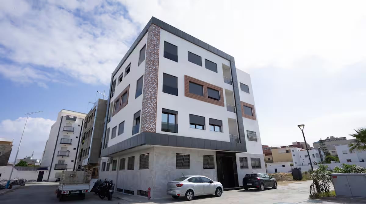 Martil Beach Escape – 1-Min Walk! YES: Hear waves. YES: Sip mint tea by the corniche. YES: Icy A/C & Netflix WiFi. Spacious 2BR with master bed, 2 singles, cozy living room, well-equipped kitchen, modern bath, fiber WiFi. Just 110m to Martil Beach! Start with crispy msemen, stroll the corniche, relax on your private shaded patio. Walk to cafés, fish grill, shawarma, shops. Walk Score: 100 – no car needed. Claim your Martil escape today!