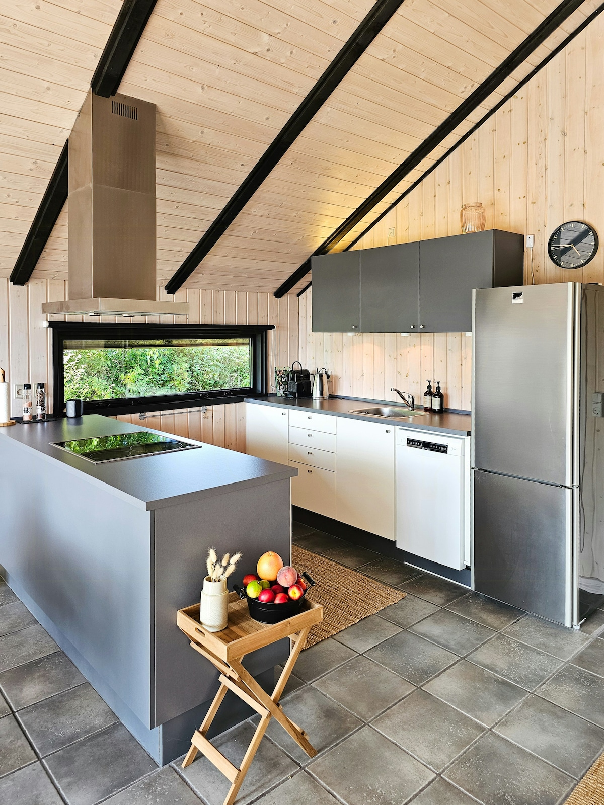 The wooden cottage lies on a big natural ground with a south facing terrace overlooking the garden, perfect to enjoy the sun! The charming house from 1959 is 48square meters. The house was renovated in 2022 with a brand new 70 square meter terrace added in 2026. The living room and kitchen takes center stage with a new fireplace for long nights in good company. Enjoy the open spaced kitchen, perfect for a cozy night with good homemade food! The 2 small bedrooms can host up to 4 people.