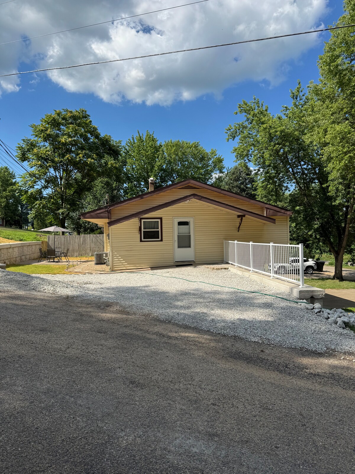 On your way, you ll drive down the scenic gravel road in the country. Relax with the whole family at this peaceful place to stay. Enjoy sitting by the out door fire pit ,fishing in the pond next to the house and walking the trails. The driveway is downhill from the road, with occasional rain runoff. You will drive past a house that is up the hill from the beach house.