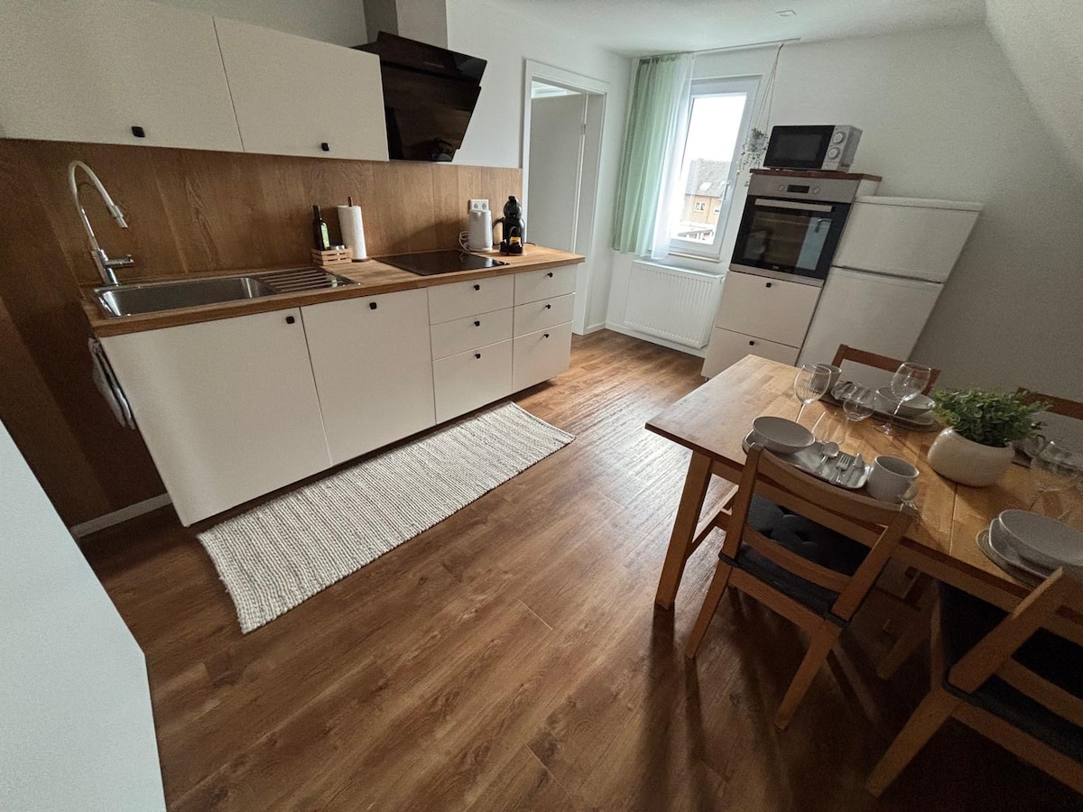 The modern apartment in the top floor is very central and quiet. It has a fully equipped kitchen-living room, a dining area, a sleeping area for 2 people, Rear sleeping area ceiling height 175 cm. In addition, there is a sofa bed in the eat-in kitchen. A private shower room. In the living/dining area there is a flat-screen TV and Wi-Fi can be provided. Ideal for 2 people