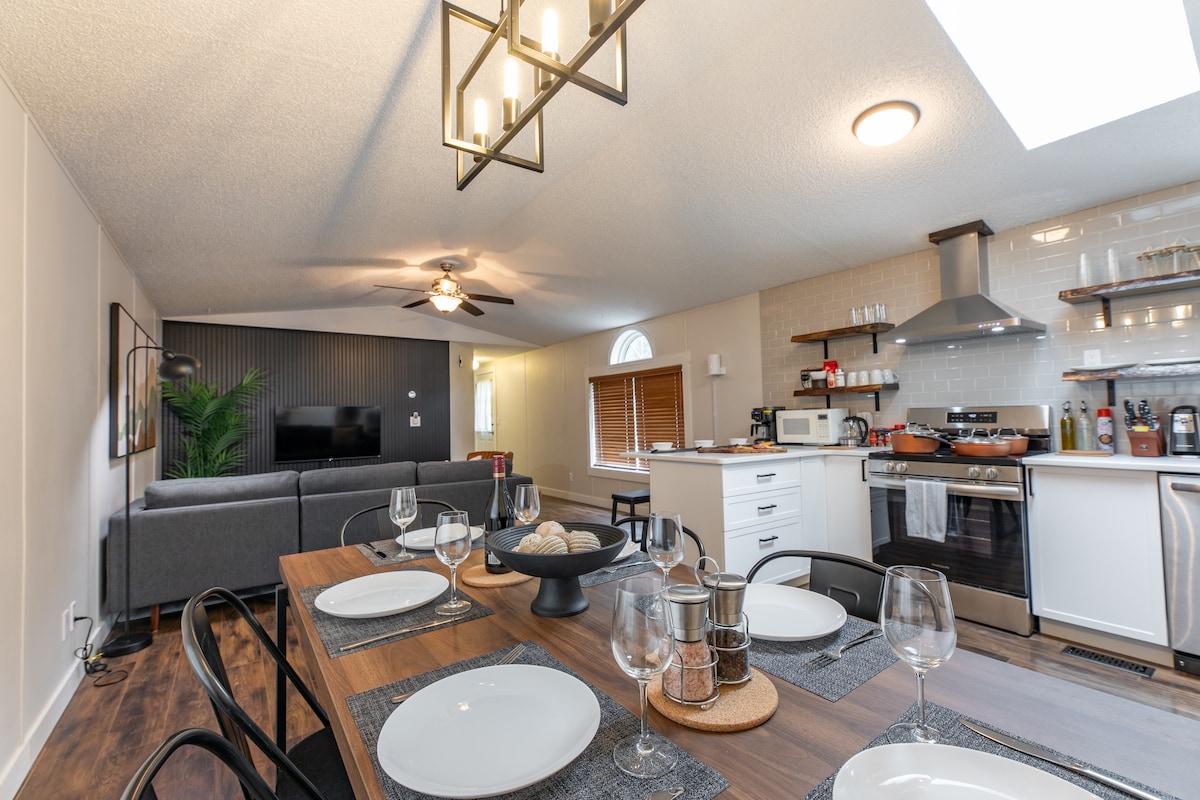 This stylish bungalow is perfect for a small group; it is your home away from home. Entire top floor of bungalow with over 1250 square foot of renovated space, 20 minutes away from Jasper national park and an hour to the town of Jasper. Essential services such as grocery, restaurants, etc. are about a three-minute drive. Fully stocked kitchen with everything you may need: Utensils, stove, fridge, dishwasher, coffee maker, Kettle, microwave, toaster, juicer, mixer, kitchenware, etc.