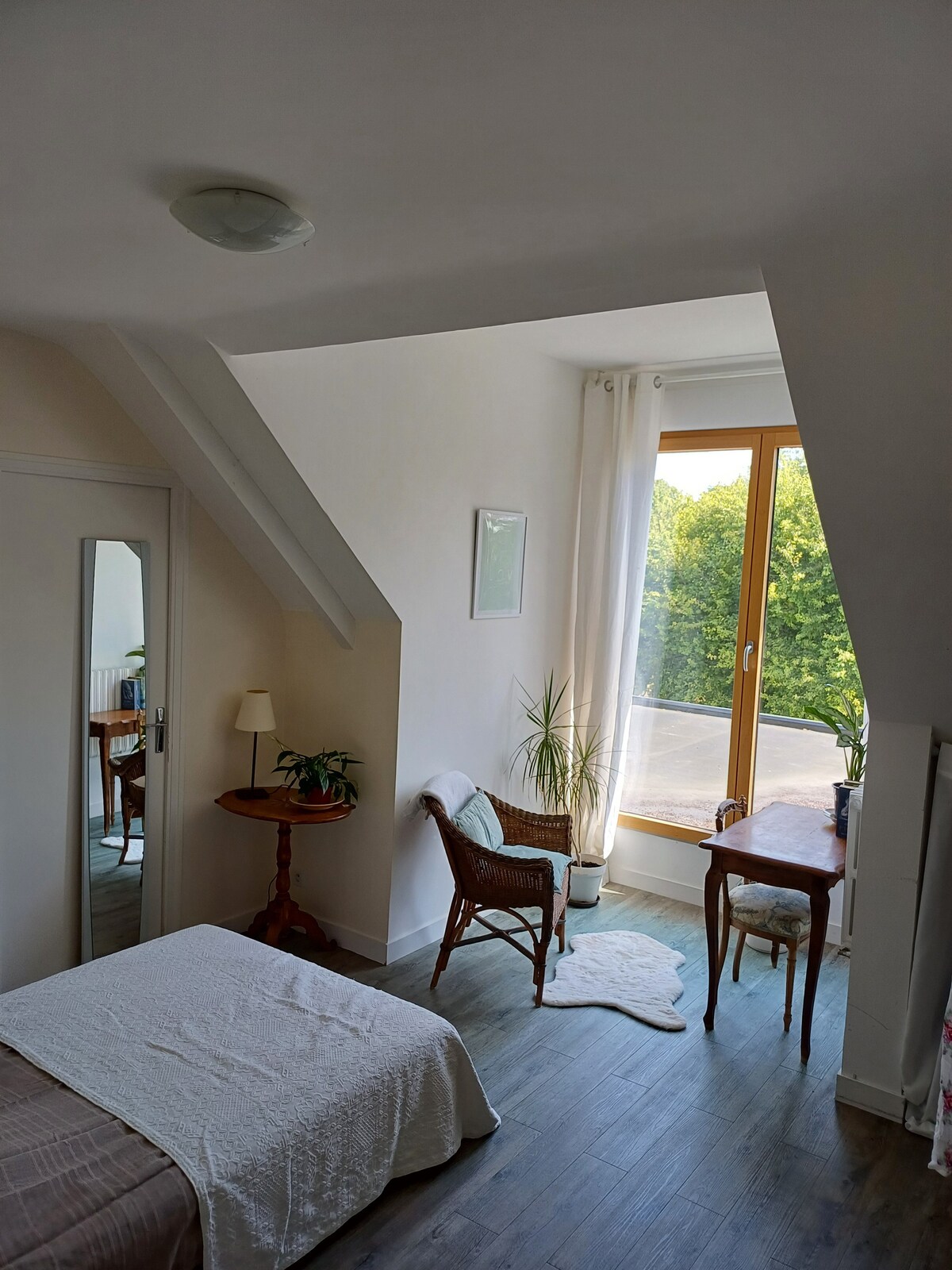2 km from exit 31 of the A84 (Caen/Rennes axis) Our house is located in the countryside in a quiet area. Independent entrance. Upstairs room dedicated exclusively to our guests with toilet and private shower room. Breakfast is included and served on the veranda. Close to the tourist sites of Fougères (20 min), Mont St Michel (30 min), the Château du Rocher Portail is only 2 km away. Beaches 40 minutes away (Jullouville) and an hour from St Malo. between Brittany and Normandy.