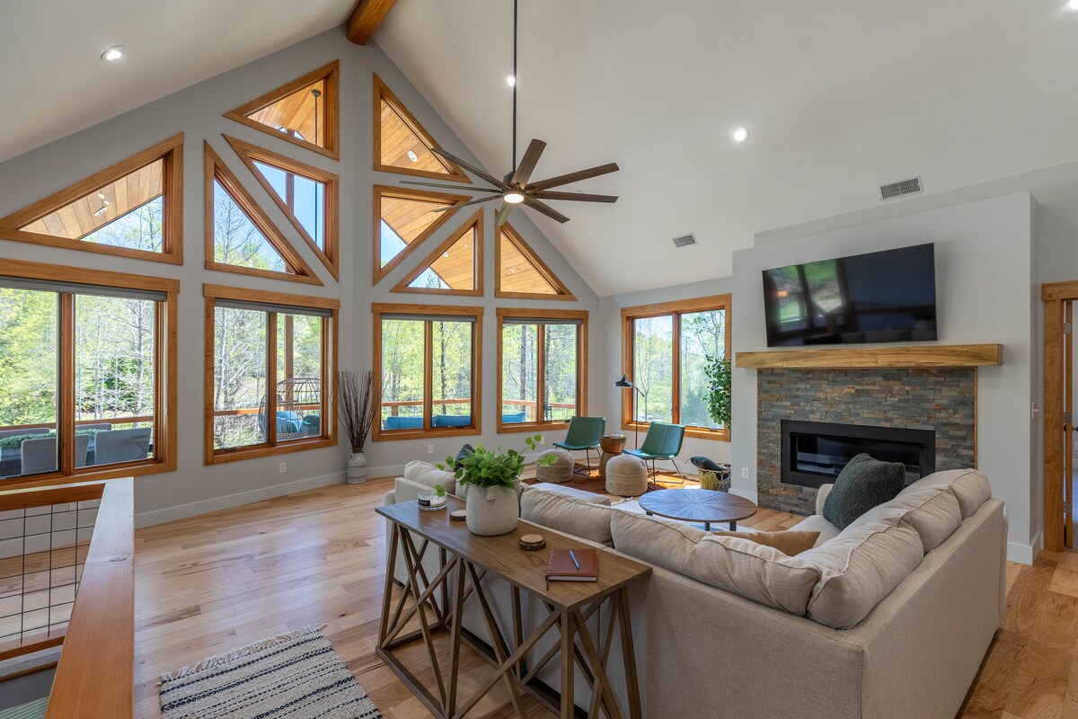 Wake up to Blue Ridge Mountain views from a stunning A-Frame retreat. This is a custom-built 4-bedroom is the most well-equipped vacation rental near Lake James. Spend mornings on the water or golf course, then relax by the fire pit or in the game room with a 70" TV. Enjoy a full gym, bunk room, and spacious kitchen. 14 mins to Marion Lake Club Golf Course, 5 mins to Bear Creek Marina, 10 mins to Lake James State Park. Perfect for families and group getaways.