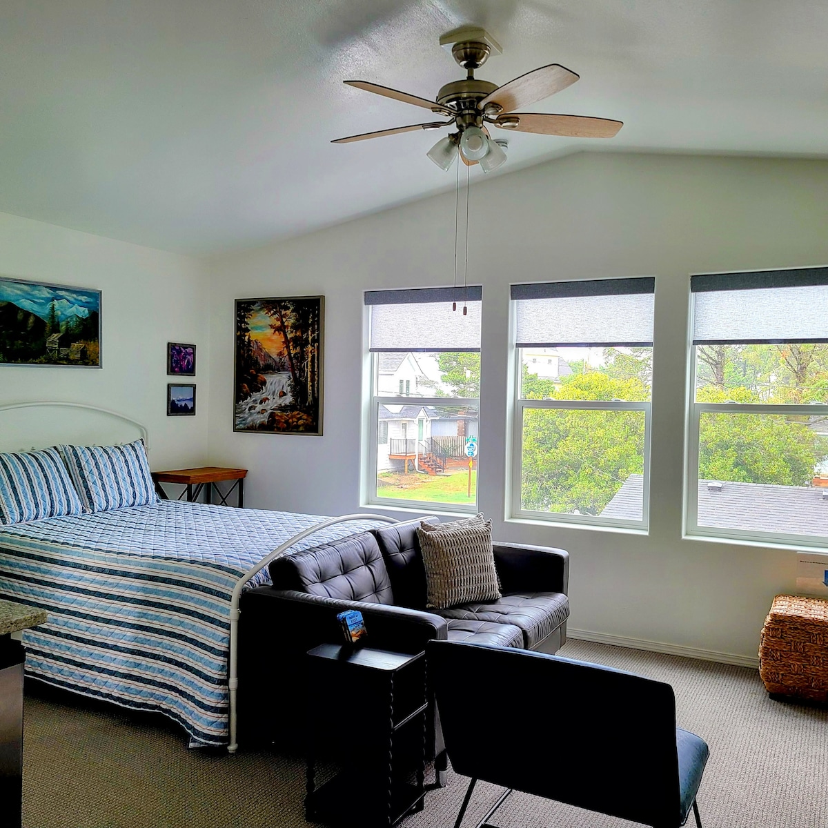 Eagle's Nest is a charming, ocean themed studio with one queen bed that features panoramic views of Depoe Bay Harbor the entire length of the studio! The ocean is on the other side of Hwy 101 so you can relax to the sounds of the crashing waves while enjoying the views of the marina and harbor. Just steps away from museums, restaurants, shopping, whale watching, fishing, and more! **There is a potential for early morning noise from the cafe on days it’s open, Hwy 101, and animals outside. **