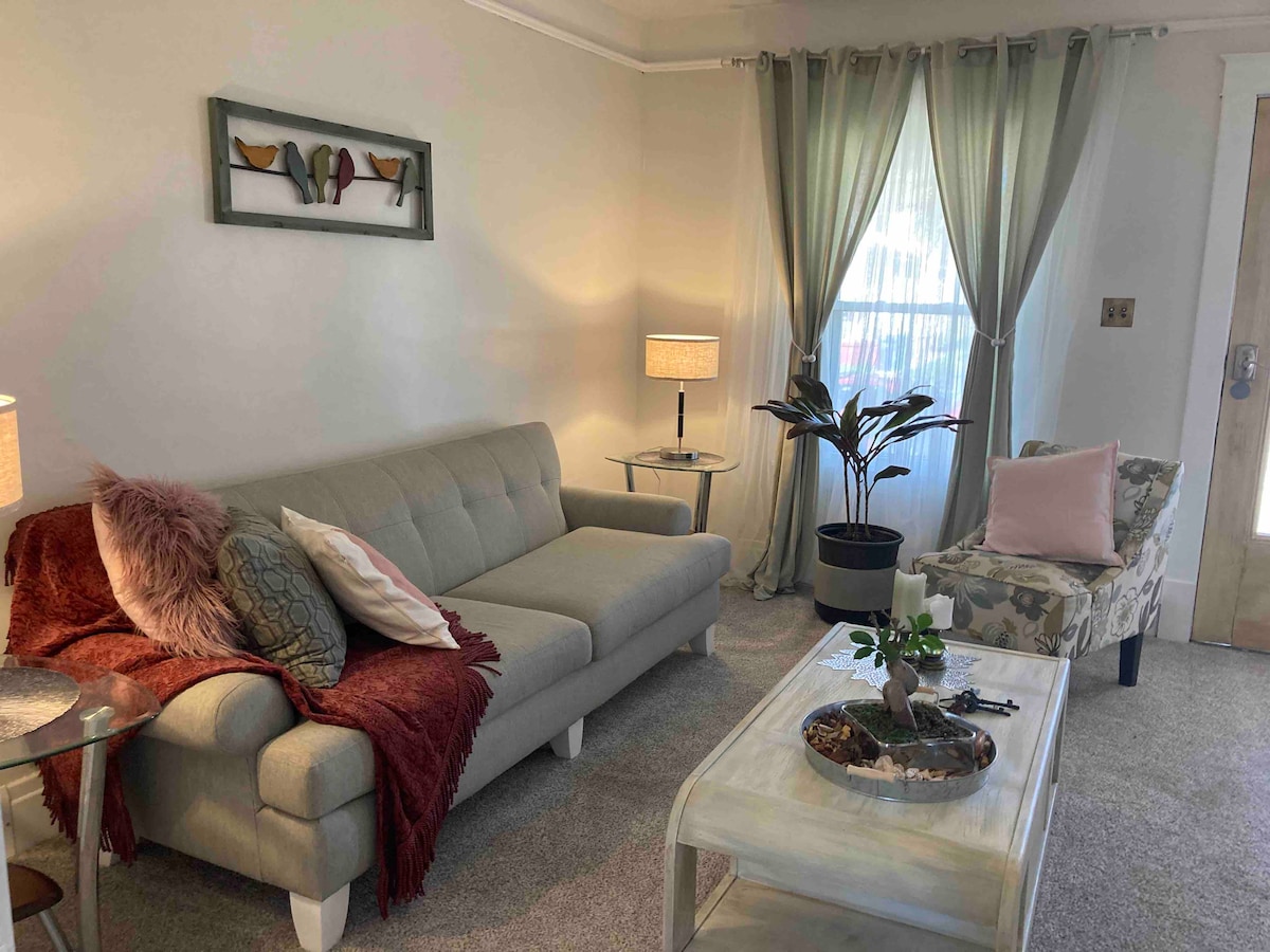 Perfectly located on Center Street, this fully remodeled second-floor retreat blends modern comfort with a touch of charm. Enjoy a well-equipped kitchen, cozy living area, comfortable bedroom, and upscale bath—all with a clean, stylish aesthetic. French doors open to views of Center Street, just steps from shops and dining. The Lower Niagara River and Artpark are nearby, and Niagara Falls is only 10 miles away—an ideal base for exploring the area.