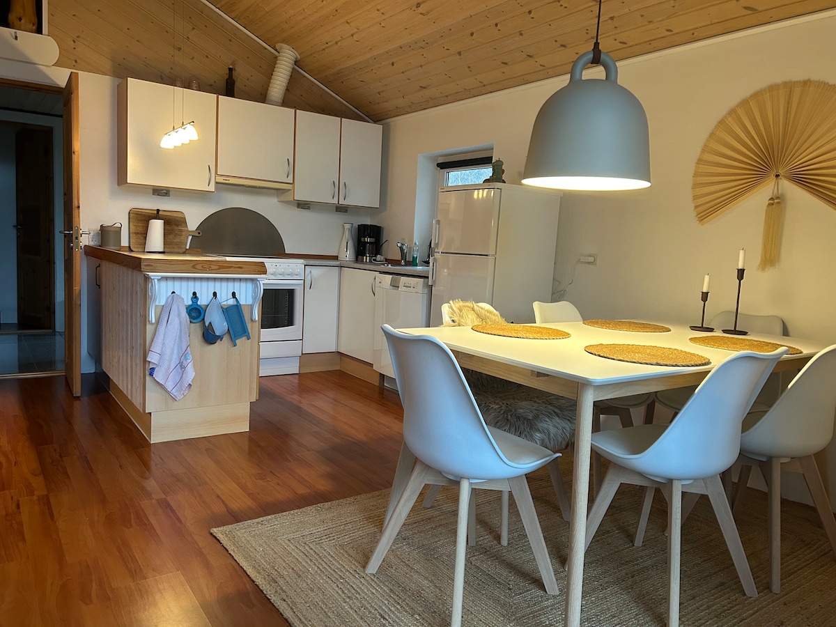 Lovely house perfect for up to 4 persons. 2 rooms with 2 beds, and bathroom with toilet and shower. From the kitchen you have acces to the living room with TV, Cromecast, SONOS, Wifi and fire place. From the living room you step out onto a terrace with furniture, which overlooks the large undisturbed nature, with visiting deer and other wildlife. The house is renovated in 2022 og 2023 and is pained black ind 2023