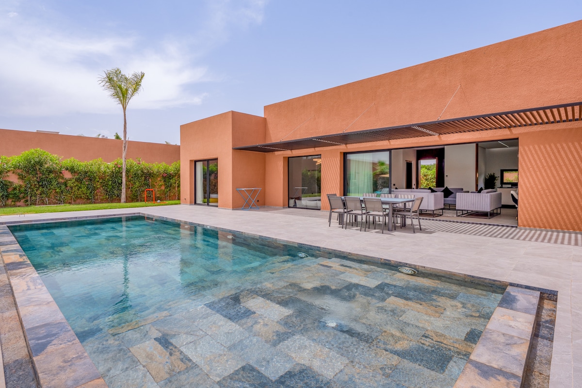 Just 10 minutes from downtown Marrakech, Villa LEANA is located in the private and secure Argan Golf Resort, with splendid views of the Atlas Mountains. Completed in March 2023, this modern villa gives you the comforts of brand new furnishings. Its elegant architecture and neat decoration make it an ideal place to gather as a family and enjoy a relaxing holiday, in a luxurious setting. Heated pool (250 Dhs/day surcharge).