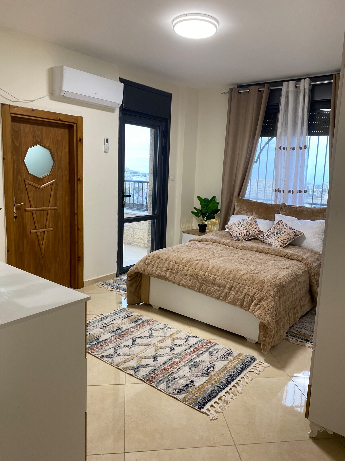 This spacious two-bedroom apartment is a 10 min walk to the city center. Enjoy easy access to transportation, nearby supermarkets, cafes, and shops, along with tantalizing Palestinian cuisine at Taghmeeseh across the street. A medical center and taxi station are also within easy reach for added convenience and stress free stay. unwind in a fully furnished space complete with a sweet balcony and fully equipped kitchen. Perfect for couples, students, small families, and business travelers.