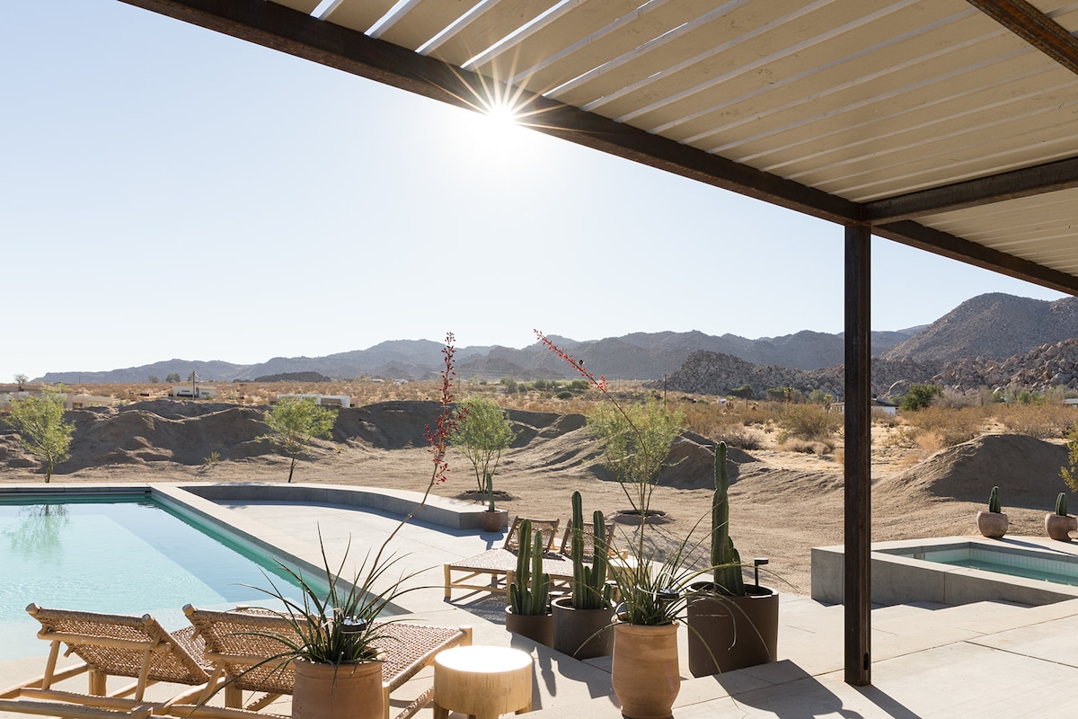 Introducing the upgraded version of our beloved desert retreat, now known as Villa Champagne. With over 420 five-star reviews under its former name, this cherished haven has undergone a transformation to elevate your desert getaway to new heights of luxury and comfort. Nestled on two acres of serene desert landscape and just a short drive from Joshua Tree National Park's west entrance, Villa Champagne offers a space to unwind and connect with nature. Perfect for those seeking a peaceful escape
