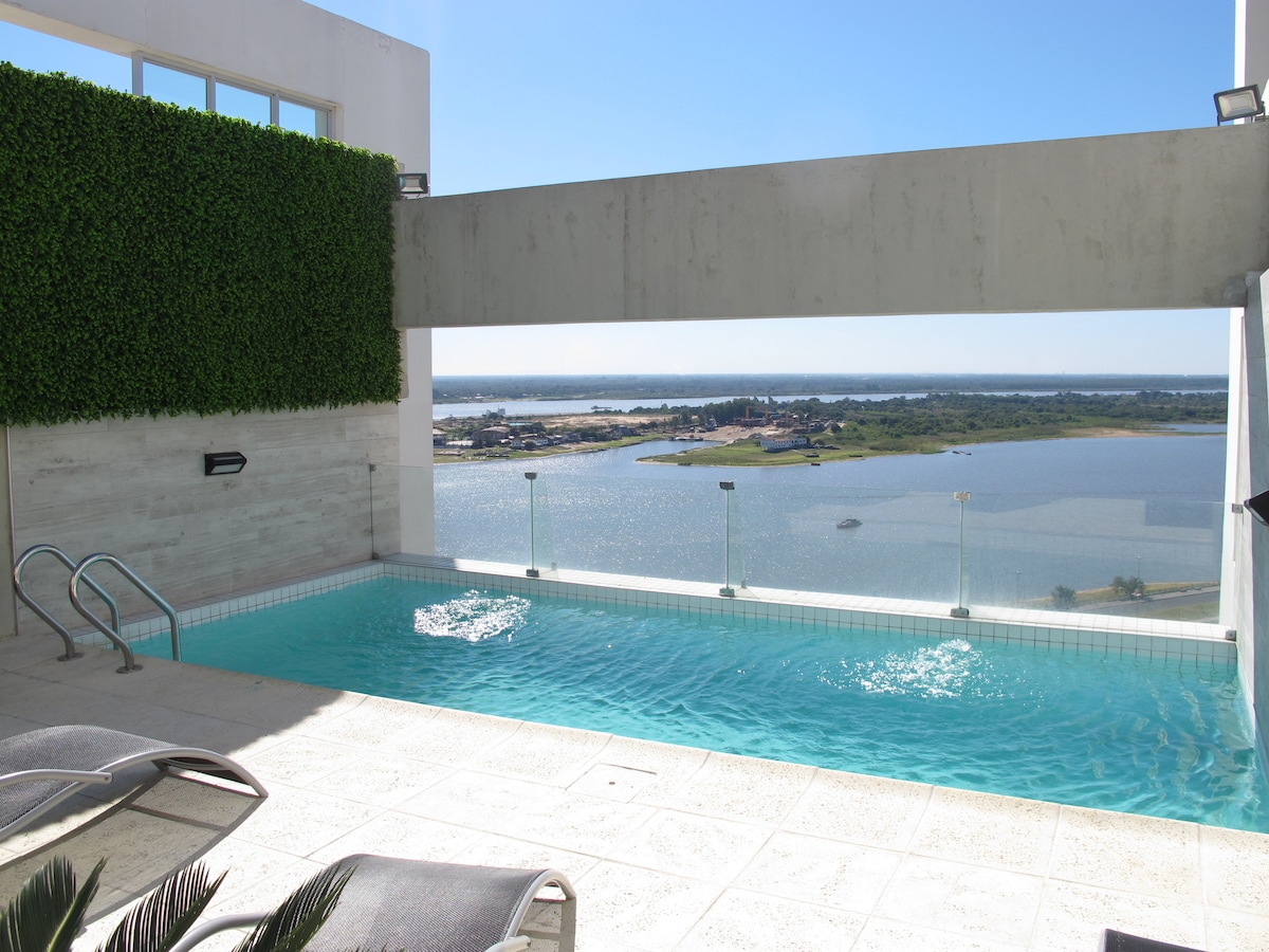 Apartment located on a high floor, with a balcony and unobstructed view, fully equipped for a comfortable stay: - King size bed with a firm, high-density mattress - Workspace with desk and WiFi connection - 55-inch Smart TV - Rooftop with pool and gym - Quincho - Laundry - 24 hour security An exceptional location: - Located in the Corporate Axis, just 5 minutes from Shopping del Sol and Paseo La Galería - 15 minutes from Silvio Pettirossi International Airport